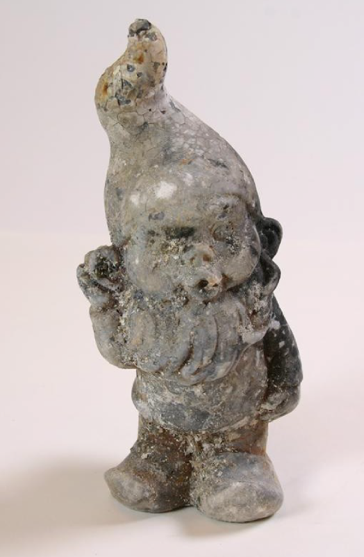 A garden gnome perches in a glass case like a Japanese teapot glazed with fly ash. Bottles slumped to half their size, glasses bent crooked in air in excess of 1300º, vases baked down to lumps are displayed. The case of a Canon camera, blown up like a metal balloon, is filled with ashy powder. I read that the camera belonged to a woman who sought refuge from the flames by climbing into the drinking water tank in her garden.