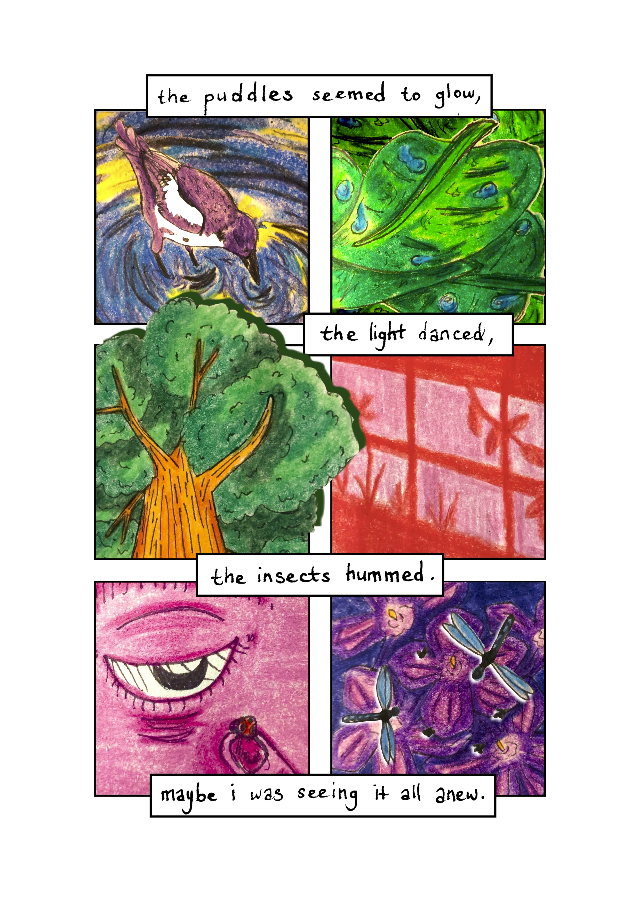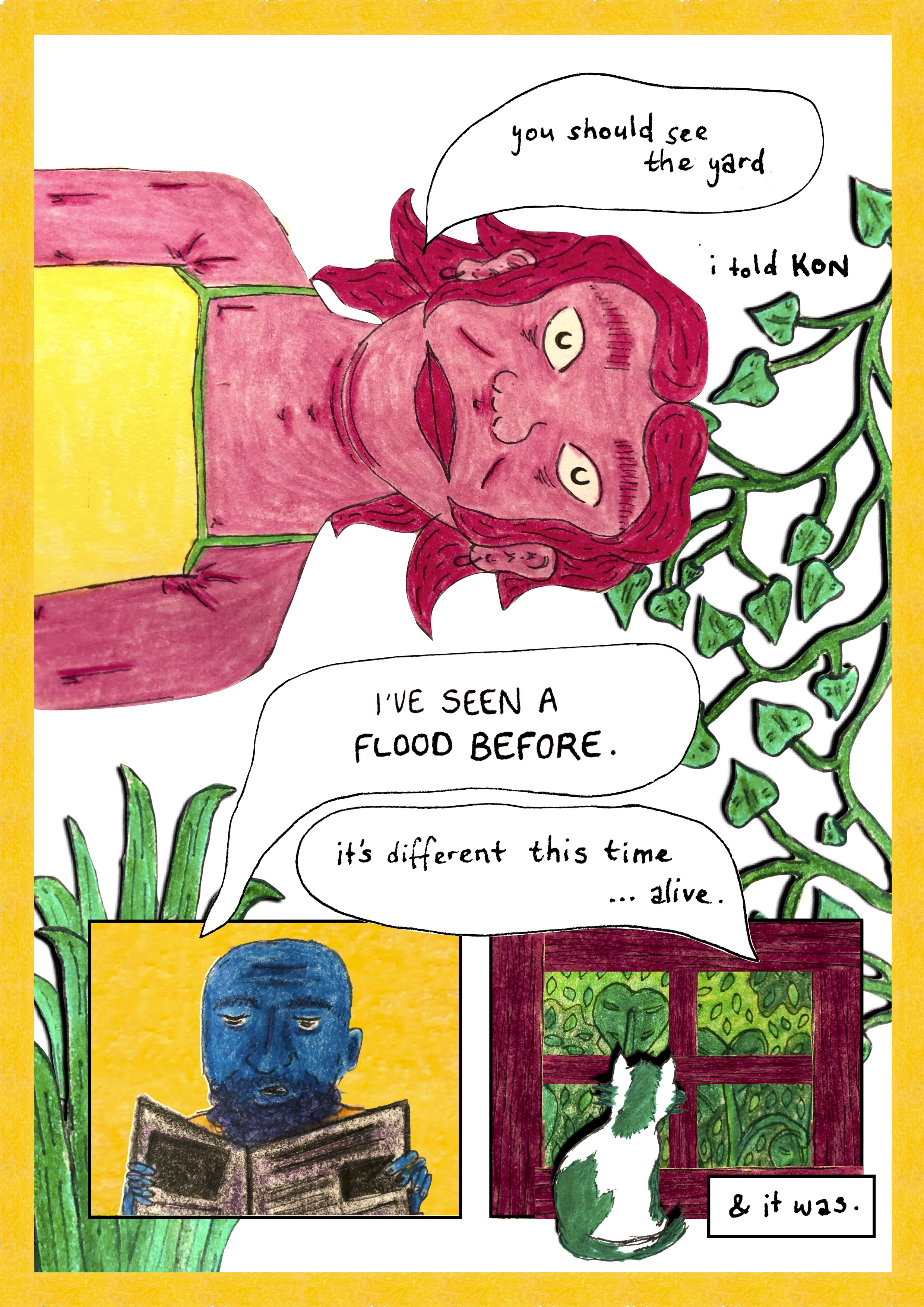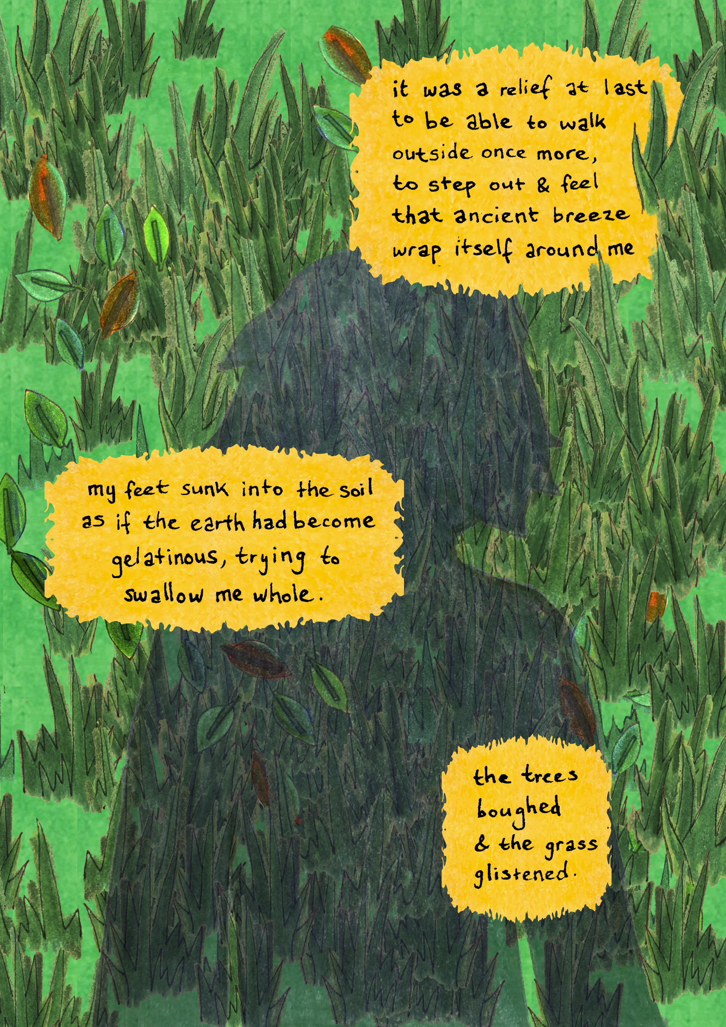 As part of The Wheeler Centre’s Hot Desk Fellowship program, Helena worked on the development of her comic exploring the story of a woman who has an affair with a swamp monster that results from the floods in her backyard. Exploring themes of queerness, self-discovery, and immersion in the natural world, the comic has been developed in a free-form style, experimenting with structure and imagery and incorporating poetic storytelling devices.