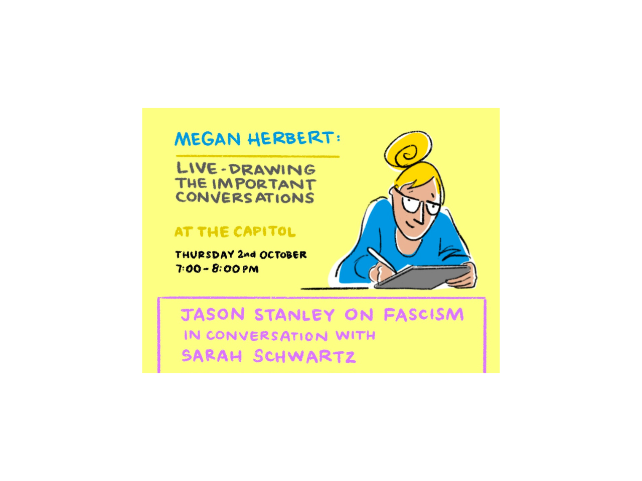 Political cartoonist and illustrator Megan Herbert was on hand to capture the conversation between Jason Stanley and Sarah Schwartz in real time, distilling its most powerful moments through her distinctive live drawings.