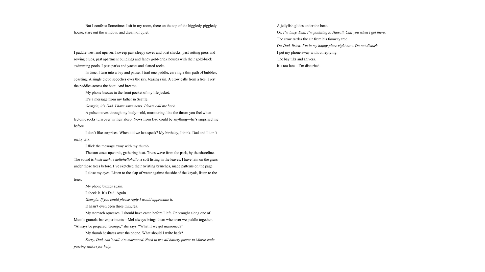 George's life is loud. On the water, though, with everything hushed above and below, she is steady, silent. Then her estranged dad says he needs to talk, and George's past begins to wake up, looping around her ankles, trying to drag her under.